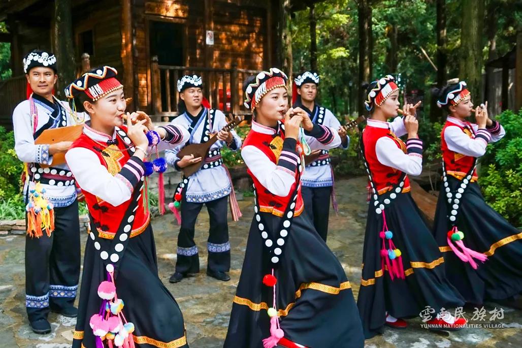 彝族在云南境內約471萬人,是省內人口最多、分布最廣的少數民族,主要聚居在金沙江、元江流域和哀牢山、無量山腹地。彝族是一個能歌善舞的民族,民間打歌、跳樂之風盛行,大三弦、跌腳舞久負盛名?;鸢压澥且妥遄罹咛厣拿褡骞澣?。彝族村占地50余畝,三虎浮雕墻與虎頭內祖師形象表現了彝族虎鷹文化。太陽歷廣場圖騰柱上有太陽、虎、火和八卦圖形象,周圍環繞著10個朝向不同的月球造型,外圓周有12生肖石雕。依山而建的“...